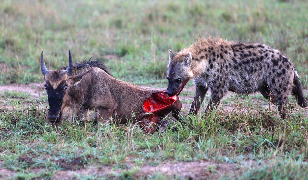 ↑ 在馬賽馬拉國家保護區,一頭遷徙中的角馬成了鬣狗的食物。在角馬遷徙過程中,獅子、獵豹、花豹、鬣狗以及馬拉河中的鱷魚等掠食動物環伺其周,伺機而動。