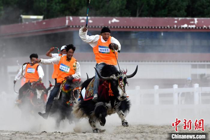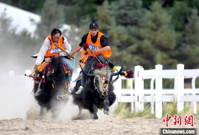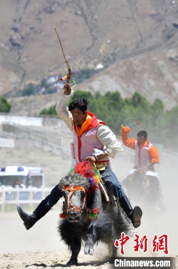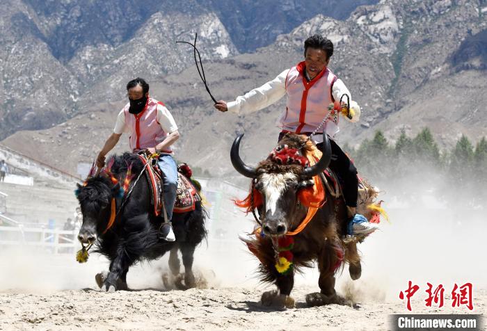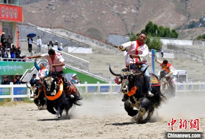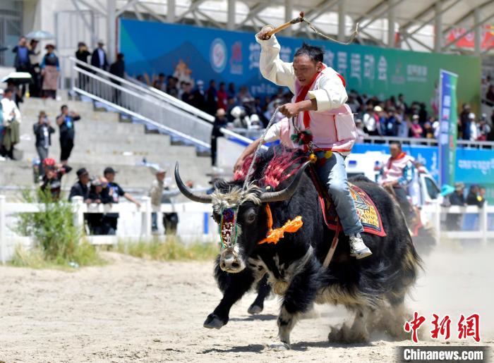 牦牛被譽為“高原之舟”,賽牦牛是藏族的傳統體育項目。6月23日,拉薩首屆農牧民運動會上的賽牦牛比賽,騎手們驅牛疾馳。圖為賽牦牛決賽比賽現場。中新社記者 李林 攝