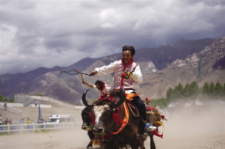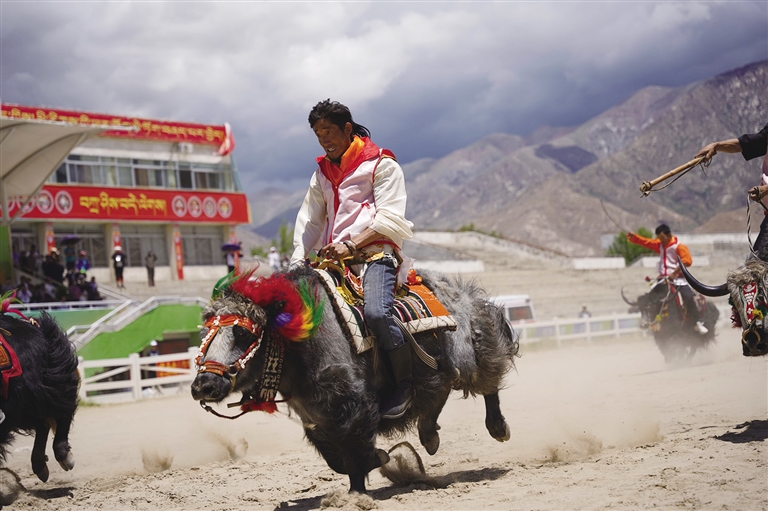 此時,賽場另一邊傳來歡呼,循聲望去,原來是本屆運動會的賽牦牛正在進行。雖然牦牛生性溫和,但讓它們聽命令奔跑,也并不容易。記者了解到,參加本屆運動會的牦牛均由主人精挑細選,主人一聲吹哨,輕微地蹬腳,牦牛就會按指令向前行進,顯得默契十足。但偶爾也會發生小狀況,比如牦牛分不清方向擠成一團,跑著跑著就停頓休息,或者原路返回等,引得觀眾頻頻發笑。