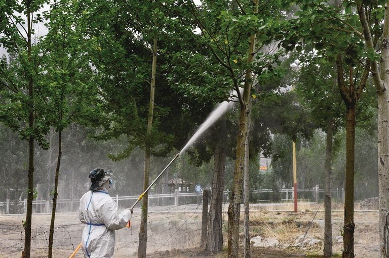 病因找到了,如何對癥下藥才是關(guān)鍵。防治隊將整片楊樹林分成三個區(qū)域,首先伐掉干死腐爛的樹,其次對病害區(qū)域進行殺菌消毒。“每個區(qū)域我們噴灑的藥劑也不同,主要是想對防治效果進行實驗。通過持續(xù)兩個月的觀察,發(fā)現(xiàn)第一組藥劑防治效果明顯,因此我們開始在整片楊樹林推廣第一組藥劑。”黃敏說。