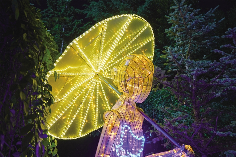 走進燈會現場,仿佛置身于一個夢幻般的世界,各式各樣的花燈錯落有致地分布在公園各個角落,令人目不暇接。宗角祿康公園的走廊里、草坪上,一盞盞精美的燈組在夜色的映襯下顯得更加璀璨奪目,展示出江南煙雨、小橋流水、青磚黛瓦、梅瓶明珠、桃花仙鶴、油傘折扇、上元燈彩等富有江蘇特色的美景雅韻,讓人似乎來到江南水鄉,親身感受那一份寧靜與美好。當然,此次燈會最引人矚目的便是“蘇拉一家親”大型燈組,運用拉薩經典配色搭建飄逸的彩帶雙翼,再搭配拉薩的吉祥物牦牛和江蘇的吉祥物麋鹿,充分表達了“蘇拉一家親,攜手向未來”的寓意。