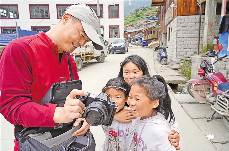 圖為日喀則市文聯(lián)采風團成員在陳塘鎮(zhèn)向小朋友展示采風照片。