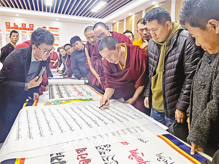 圖為日喀則市文聯(lián)組織書法協(xié)會開展藏文書法交流活動。