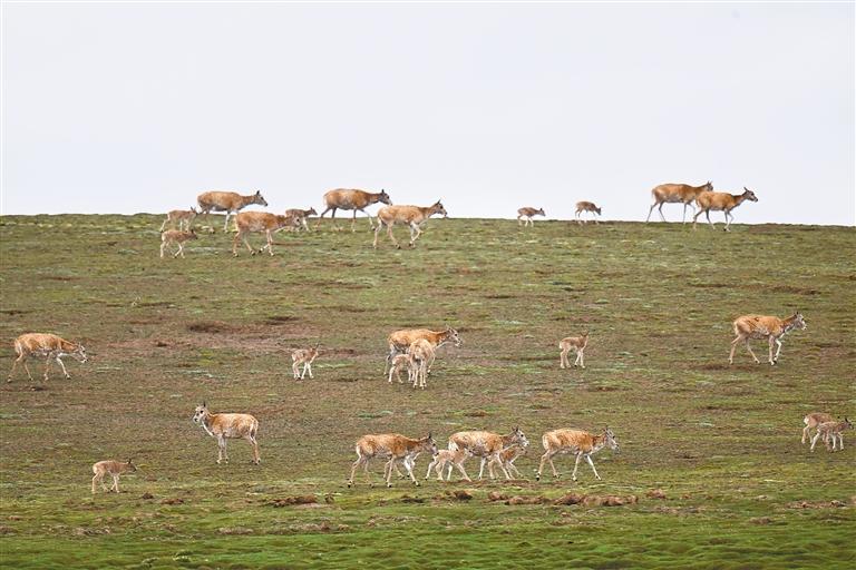 卓乃湖位于世界自然遺產地可可西里腹地。今年5月以來,來自青海三江源、新疆阿爾金山、西藏羌塘等地的雌性藏羚羊陸續遷徙至卓乃湖區域產仔。7月下旬開始,產仔結束后的雌性藏羚羊將再攜幼仔返回原棲息地。