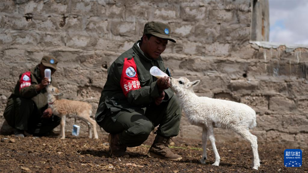 尼瑪縣措羅木管護站野保員在給白色藏羚羊幼崽喂奶(7月13日攝)。新華社發(旦增攝)