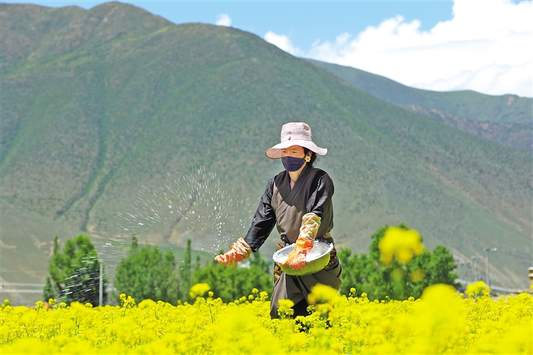 墨竹工卡縣唐加鄉拉東村村民正在油菜花田里施肥。