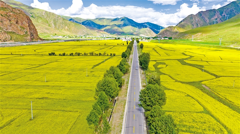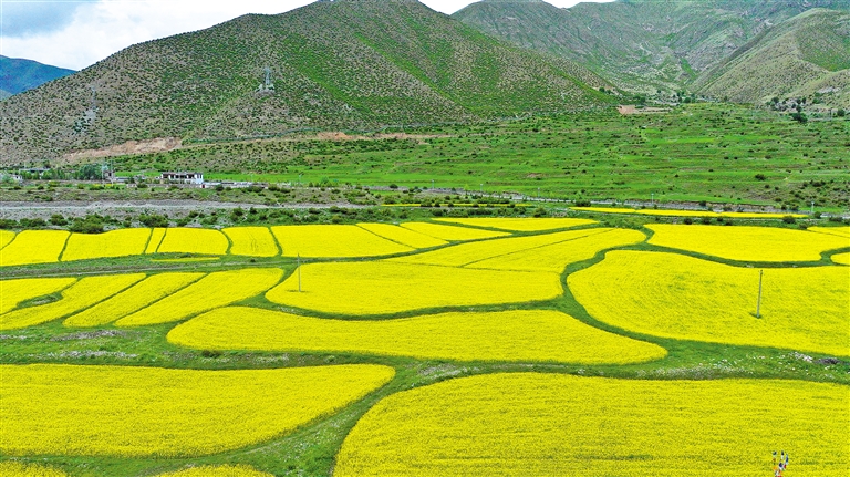 最近,墨竹工卡縣迎來了油菜花的盛開時節。放眼望去,滿目的油菜花如同金黃色的毯子般鋪展開來,在微風中搖曳,散發出迷人的香氣。一團團、一簇簇的金黃色花朵點綴在田野上,流動著濃濃夏意。成片的花海與蜿蜒的農村公路、錯落有致的村居共同構成了一幅和諧美麗的田園風景圖。