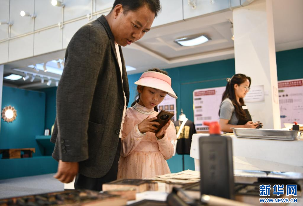 7月19日,一名小朋友在家長陪同下拍攝感興趣的西藏雕版印刷品。
