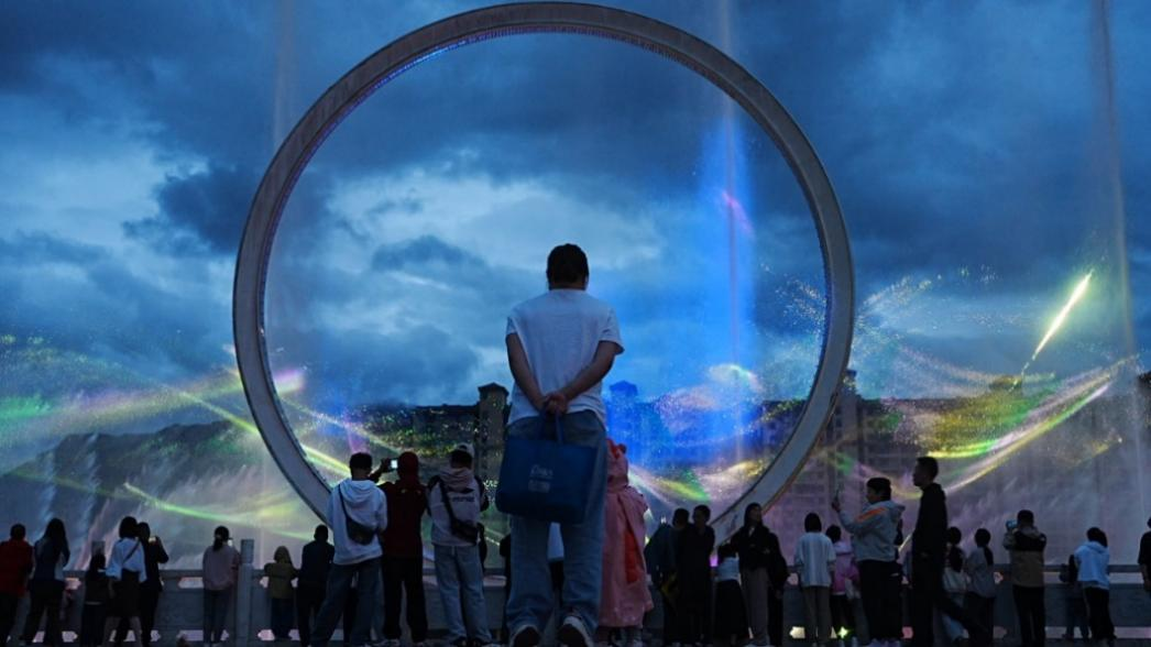日落西山,微風輕撫,林芝市工布公園里熱鬧又悠閑。絡繹不絕的游客和市民前來觀看夢幻水秀表演,絢麗多彩的燈光秀引得觀眾發出陣陣驚呼。