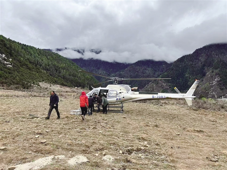 直升機裝載相關設備,準備起飛監控堰塞湖情況。