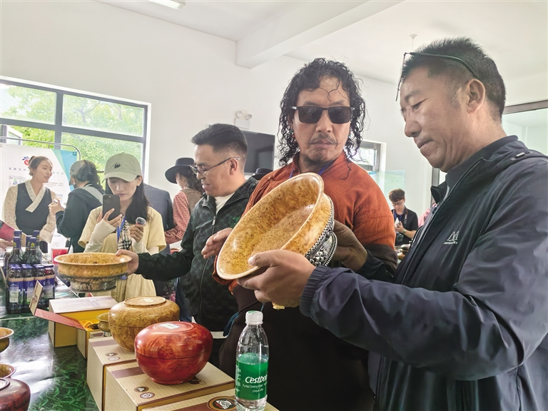 探訪團一行前往西藏山南加查達布傳統(tǒng)文化產(chǎn)業(yè)發(fā)展有限公司探訪加查木碗的制作技藝。在該公司的展廳內(nèi),西藏自治區(qū)級加查木碗非遺傳承人、公司負(fù)責(zé)人桑珠向探訪團詳細(xì)講解了加查木碗從選材、切割、打磨到雕刻的每一個制作環(huán)節(jié)。桑珠拿起一個個造型各異、原材料不同的木碗向探訪團介紹著木碗的品質(zhì)分辨技巧、用處等。楊樹、松樹、柏樹……一塊塊承載著歲月的木頭,經(jīng)過木匠們的一道道復(fù)雜的工序后,變成了精美的藝術(shù)品。“這種碗面像圓珠筆點涂的是上等木料制成的精品,最低售賣價值可達到4000元一個。”桑珠說,“現(xiàn)在來買木碗的人越來越多,很多游客也會買回去當(dāng)伴手禮。這讓我更加堅定了傳承和發(fā)展這項技藝的決心。”