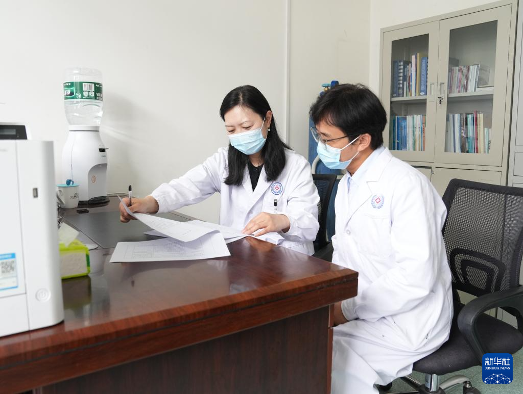 在西藏自治區人民醫院,徐鐘慧(左)與徒弟旦增晉美在辦公室內交流(8月9日攝)。新華社記者 丁汀 攝