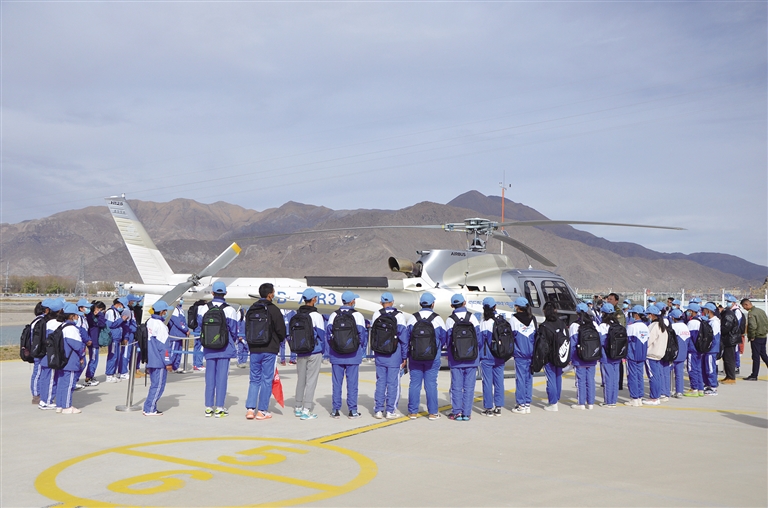 拉薩市中學生開展“游學幸福新拉薩 共筑美麗中國夢”主題研學實踐教育活動,參觀高原直升機。