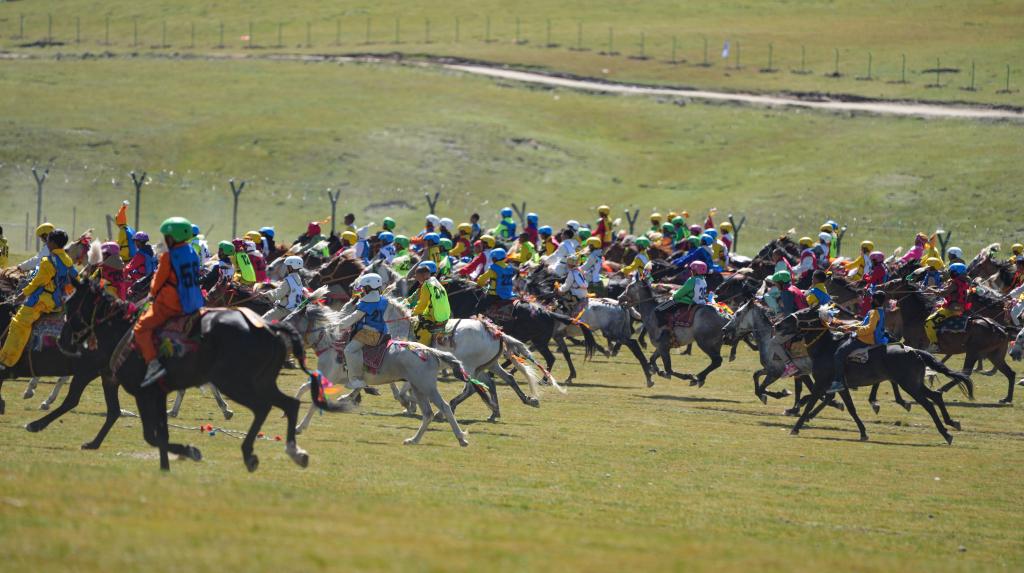 12日,10公里傳統大跑項目開賽,上百匹駿馬在草原上揚蹄疾奔,騎手多是十來歲的少年。15歲的普扎巴從6歲開始做騎手,曾騎著當地許多名馬到各地參加比賽,拿過多次冠軍?!拔蚁嘈胚@次也能拿第一名。”10日,他在馬背上對記者說。