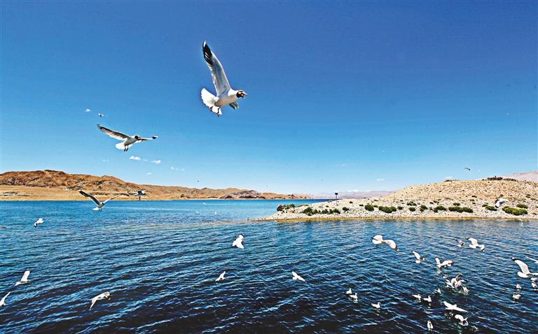 “現在的拉薩河更像一個湖,湖寬水深、濤聲陣陣,金色的陽光灑滿湖面,一陣風吹來,掀起了不少漣漪。成群結隊的候鳥在湖面自由自在地翱翔、嬉戲,讓人心曠神怡。”傍晚時分,家住頓珠金融城的拉薩市民平措在拉薩河三號閘上悠閑散步、感慨地說道。