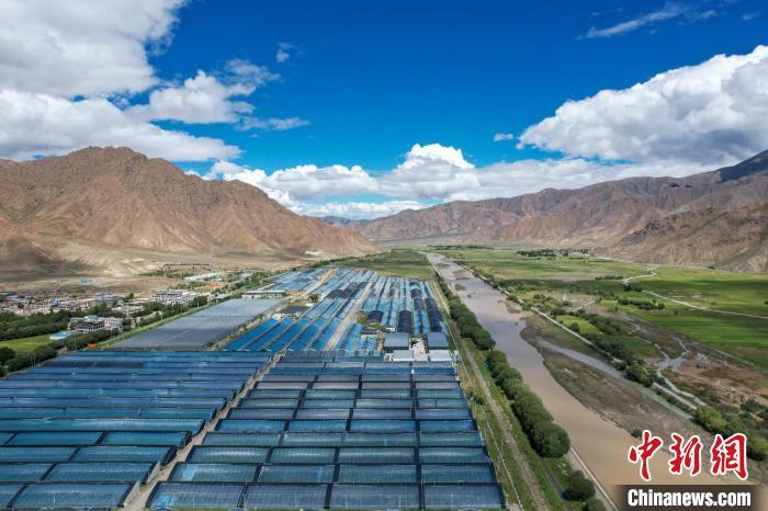 經過近三十年的發展,西藏白朗縣大棚蔬菜產業已具規模。圖為航拍白朗縣年楚河畔的大棚設施。記者 江飛波 攝