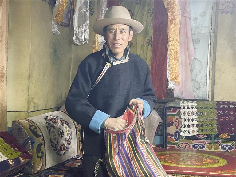 放牧巡邊途中的經歷,格桑覺得只是日常的事情,并沒有什么值得講述的。不過,他也有特別珍視的東西。格桑特意走進另一間屋子,捧出一個略顯舊色的布袋。他小心打開袋子,里面是他珍藏的一面面國旗。