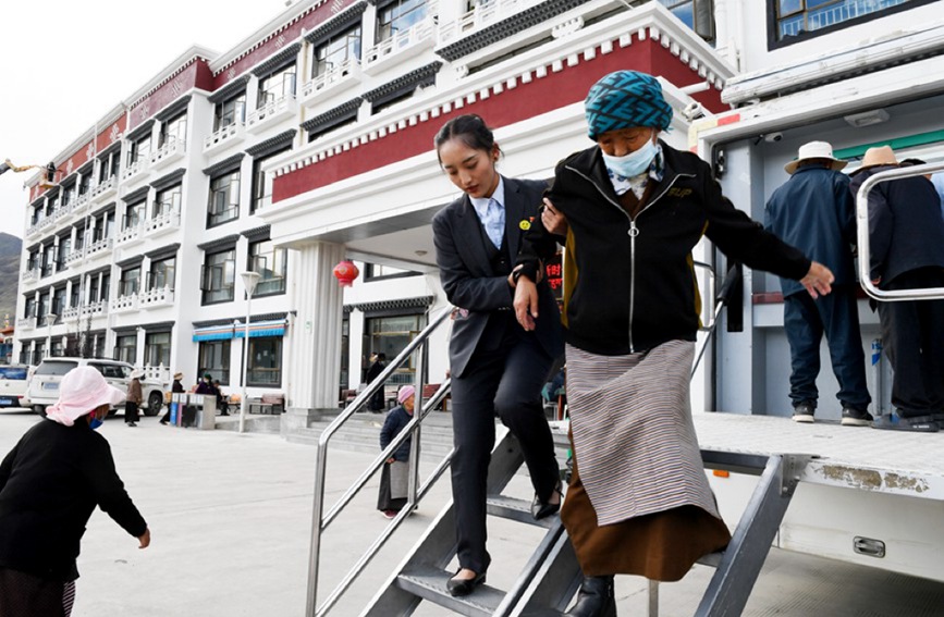 圖為農行山南乃東支行客戶經理娜姆措(左一)攙扶老人走下流動金融服務車。旦增蘭澤攝