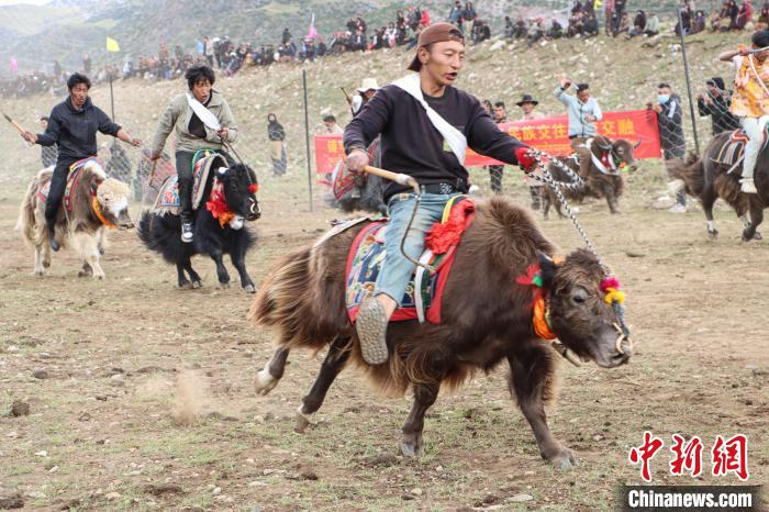 賽牦牛活動現場,牧民將自家的牦牛精心打扮,信心滿滿地走上起跑線,一聲令響,眾騎手驅牛疾馳。現場呼聲陣陣,高潮迭起,為每一頭疾馳的牦牛加油歡呼。