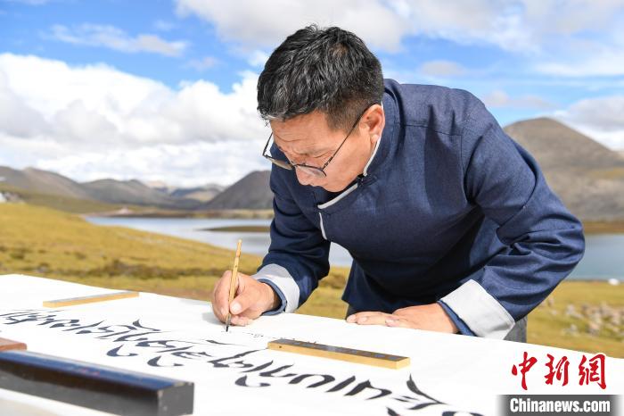 圖為書法家在思金拉措湖邊用藏文書寫“思金拉措”。貢嘎來松 攝