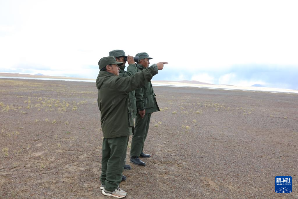 野生動物專業管護隊員在令戈錯旁巡護(9月8日攝)。新華社記者 劉詩平 攝