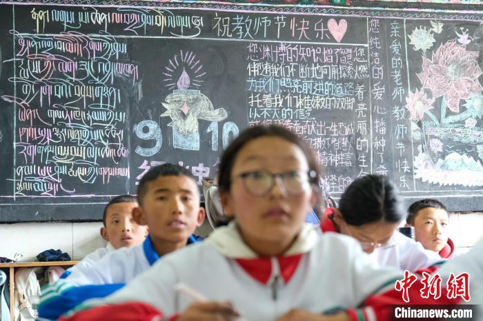 9月9日,西藏浪卡子縣中學一班級學生繪寫的教師節主題黑板報,表達對老師的尊敬與感謝。中新社記者 江飛波 攝