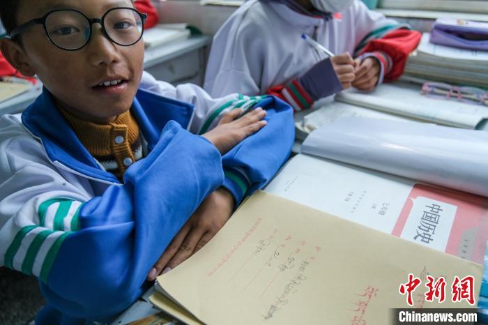 9月9日,西藏浪卡子縣中學初一年級學生展示他的中國歷史及藏語文教材。中新社記者 江飛波 攝