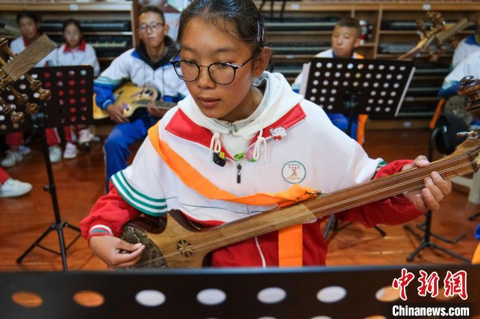 9月9日,西藏浪卡子縣中學初二年級白瑪卓嘎彈唱六弦琴。中新社記者 江飛波 攝