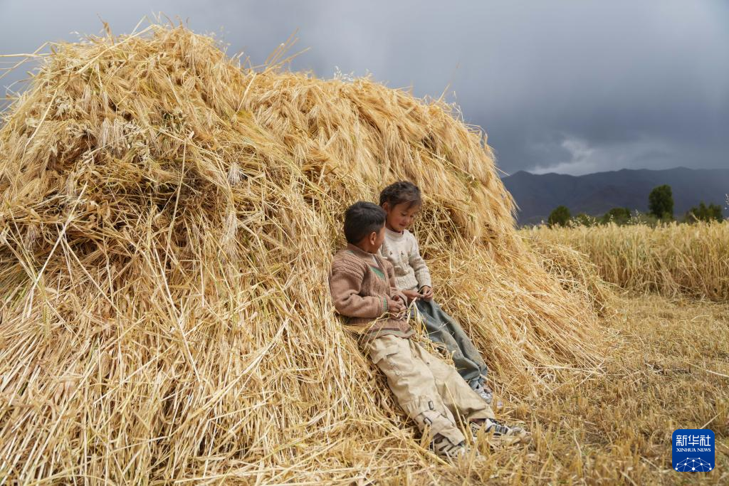 9月10日,在西藏日喀則市白朗縣巴扎鄉,孩子們靠在青稞垛上玩耍。新華社記者 晉美多吉 攝