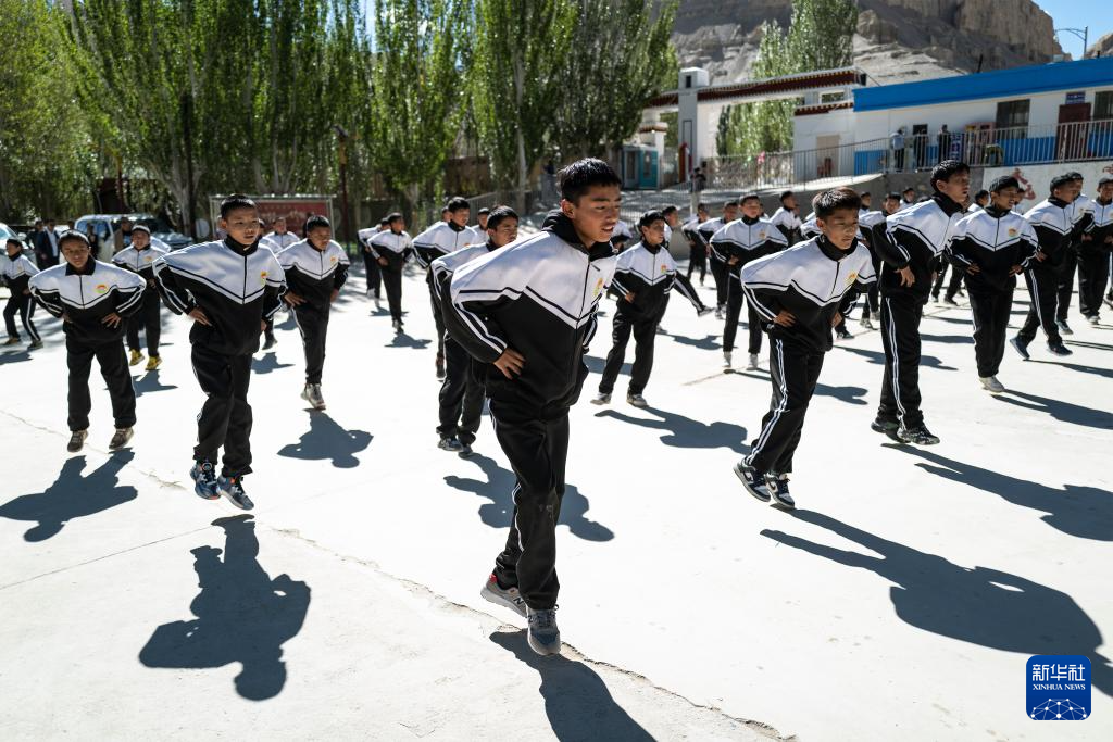 在西藏阿里地區札達縣九年一貫制學校,孩子們跳起融入國家級非物質文化遺產“宣舞”特色的課間操(9月10日攝)。新華社記者 孫瑞博 攝