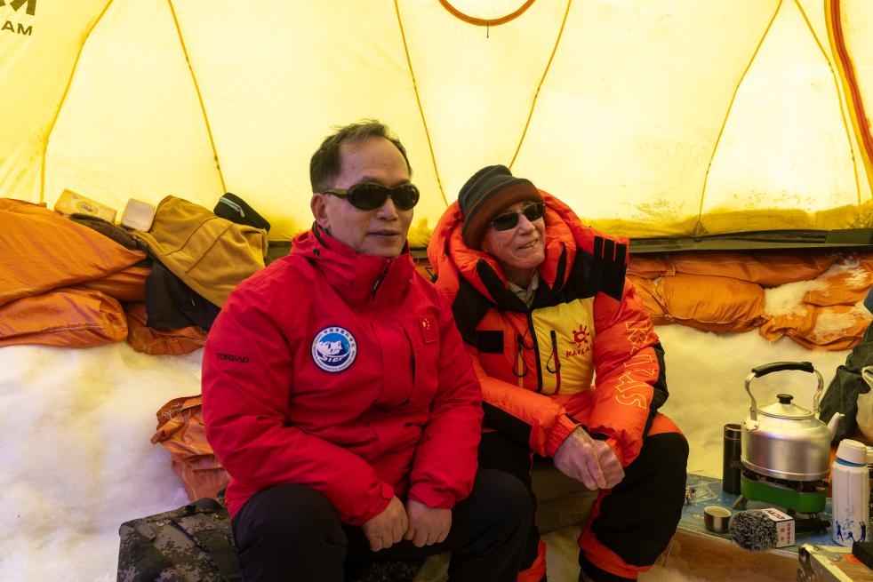 姚檀棟(左)、湯普森在普若崗日冰原10號冰川冰穹C作業(yè)點(diǎn)工作帳篷內(nèi)查看作業(yè)情況時(shí)合影。新華社記者姜帆 攝