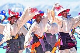 舞蹈演員在納木錯開湖活動現場表演。新華社發