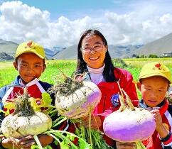 在珠峰腳下的田地里,生態學專家和學生們一起展示收獲的蕪菁。新華社發