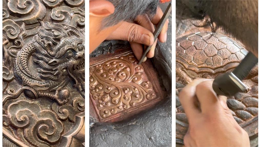 所謂錘揲法,是以銅片或金銀板片為原料,使用鐵臂、鐵套、榔頭、鏨子等工具,敲打出浮雕紋樣、各類造像、建筑裝飾等,對工匠造型能力與經(jīng)驗要求很高。