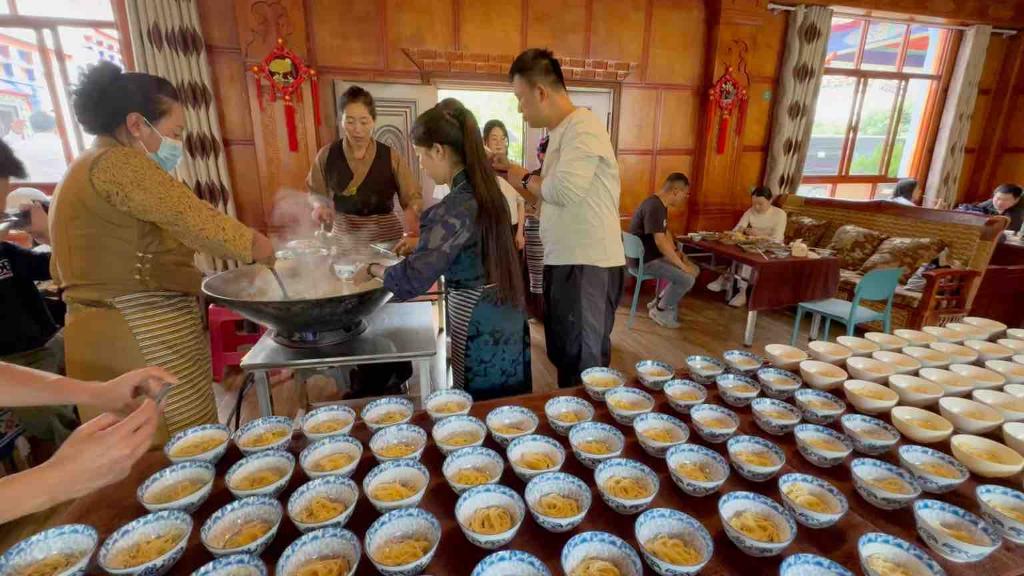 “目前店里紀錄保持在147碗。”在納西民族鄉(xiāng)經(jīng)營果拉叢農(nóng)家樂的果拉卓瑪說,“但生活再好也不能浪費。我們會提醒客人,如果吃飽了,只需用筷子在碗上搭出尖尖,就會停止加面;但對于不搭筷子的客人,我們還會再勸一碗。”