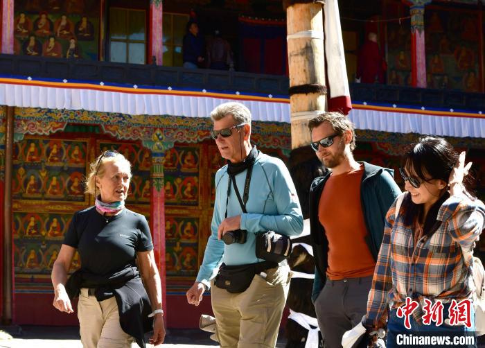 10月1日,外國游客在西藏自治區日喀則市扎什倫布寺內參觀。國慶假期首日,始建于公元1447年的扎什倫布寺成為眾多中外游客的首選。中新社記者 李林 攝