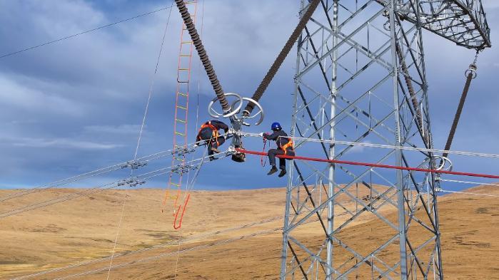 9月的林周,高原的陽光刺得睜不開眼。在走線現(xiàn)場,小組負責(zé)人扎西頓珠指揮兩名工作人員上塔進行懸掛接地線,隨后,兩名走線人員頂著強烈的紫外線對2329號至2325號鐵塔開展線路走線工作,在走線過程中,他們認(rèn)真檢查導(dǎo)線有無磨損、斷股、嚴(yán)重銹蝕、外層損傷、零部件缺失等缺陷。現(xiàn)場走線組負責(zé)人扎西頓珠向記者介紹“在高海拔、大溫差、強風(fēng)沙的氣候環(huán)境下,設(shè)備長期暴露在外,受到風(fēng)吹日曬雨淋,為精準(zhǔn)掌握設(shè)備狀況,每年年檢都要開展走線消缺工作。”