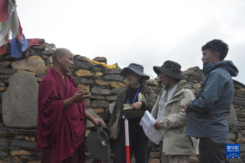普查隊員正在向了解當地歷史文化的僧人咨詢塔巴遺址歷史沿革。新華社記者 春拉 攝