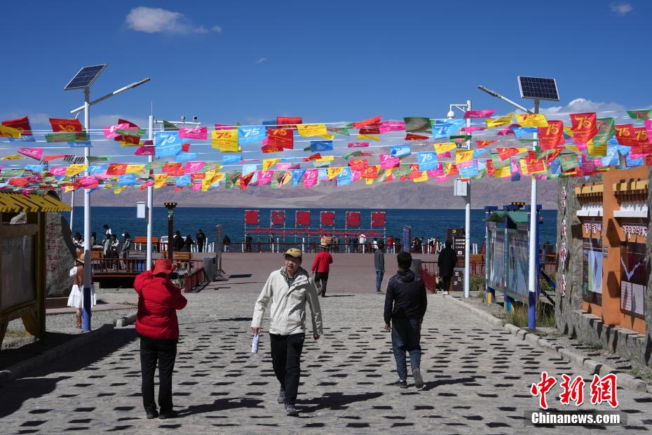 10月4日。“十一”國慶假期,不少游客來到西藏日土縣班公湖游玩。中新社記者 崔楠 攝