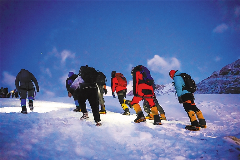 徒步至海拔5500米左右時,坡度變陡,需要借助上升器向上攀登。此時,自治區登山隊的向導們早已在路線上固定好了安全繩,每隔100米打一個錨點,并安排人員守護在一旁,幫助山友們依次掛好主鎖,固定好上升器。“大家一定要按照自己的節奏,踩著前人的腳印慢慢往上爬,不要自己新踩腳印,會消耗體力。時間還很充足,大家注意分配好體力,最后都能登頂。”在攀登過程中,自治區登山隊向導阿旺細心叮囑與鼓勵著從他面前經過的人。