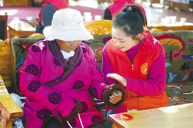 圖為那曲市索縣新時代文明實踐中心為特困人員集中供養(yǎng)服務中心的老人送去關(guān)心和關(guān)愛。記者 曲珍 通訊員 王霖 攝
