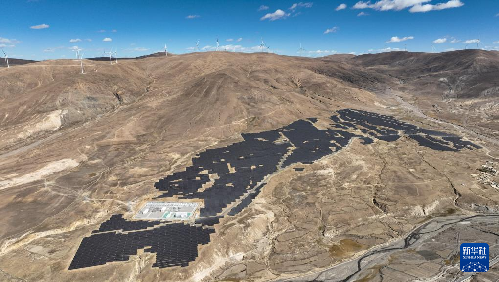 10月17日拍攝的位于西藏日喀則市薩迦縣的中核薩迦300兆瓦風光儲一體化電站(無人機照片)。新華社記者 晉美多吉 攝