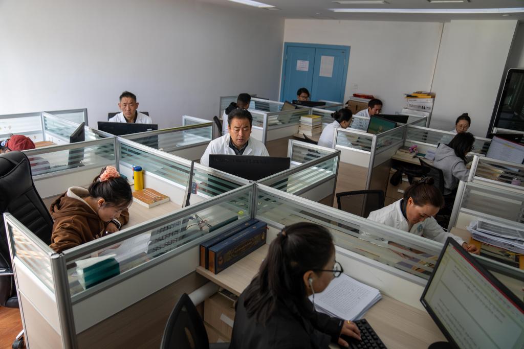 藏醫藥與天文歷算數字化資源中心的科研人員在錄入數據(10月17日攝)。新華社記者 旦增尼瑪曲珠 攝