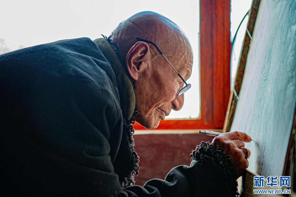 10月17日,今年92歲的昌都嘎瑪嘎赤畫派國家級非遺傳承人嘎瑪德勒在家畫唐卡。新華網 旦增努布 攝