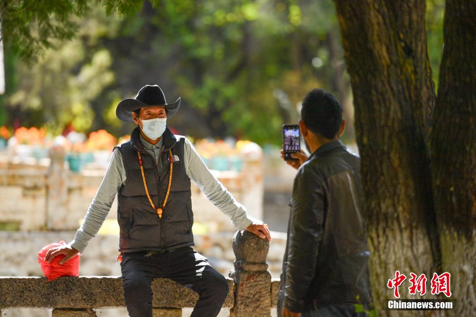 金秋十月,拉薩市西郊羅布林卡秋意正濃,景色宜人。眾多市民、游客紛紛前往打卡。羅布林卡藏語意為“寶貝園林”,始建于公元十八世紀40年代,是典型的藏式風格園林,也是西藏的世界文化遺產之一,有格桑林卡、措吉頗章、金色頗章等宮殿建筑群。這里秋景如畫,成為人們感受自然與歷史文化的好去處。圖為10月21日,民眾在羅布林卡內拍照留念。貢確 攝