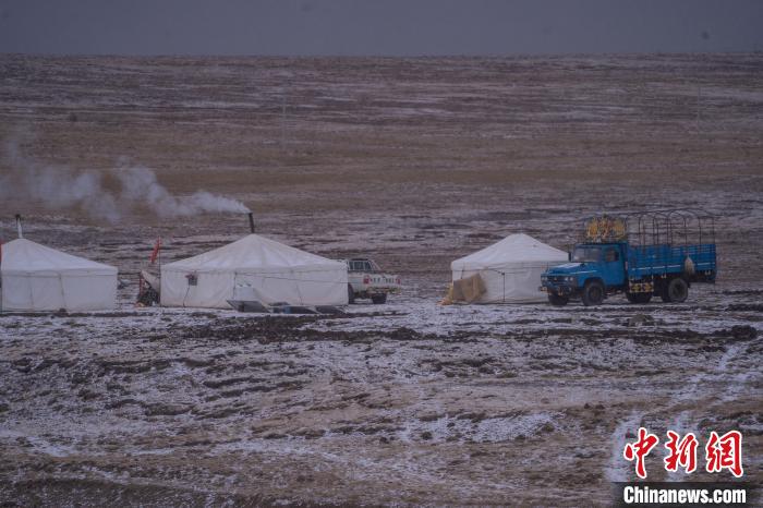 10月23日,西藏自治區那曲市安多縣多瑪鄉牧民在雪中放牧。當日,一場雪將藏北草原裝扮得如詩如畫。牧民們在這銀裝素裹的天地間,開始了雪中放牧的生活。牛羊在雪地中悠閑覓食,牧民駕駛著摩托車,在雪中放牧,形成了一幅動人的風景畫。圖為牧民在草原上搭建的帳篷。中新社記者 貢嘎來松 攝