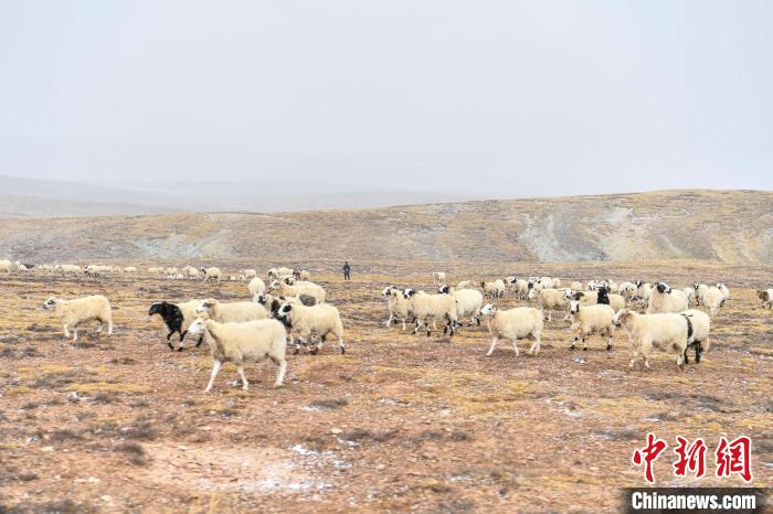 10月23日,西藏自治區那曲市安多縣多瑪鄉牧民在雪中放牧。當日,一場雪將藏北草原裝扮得如詩如畫。牧民們在這銀裝素裹的天地間,開始了雪中放牧的生活。牛羊在雪地中悠閑覓食,牧民駕駛著摩托車,在雪中放牧,形成了一幅動人的風景畫。圖為羊群在草原上覓食。中新社記者 貢嘎來松 攝