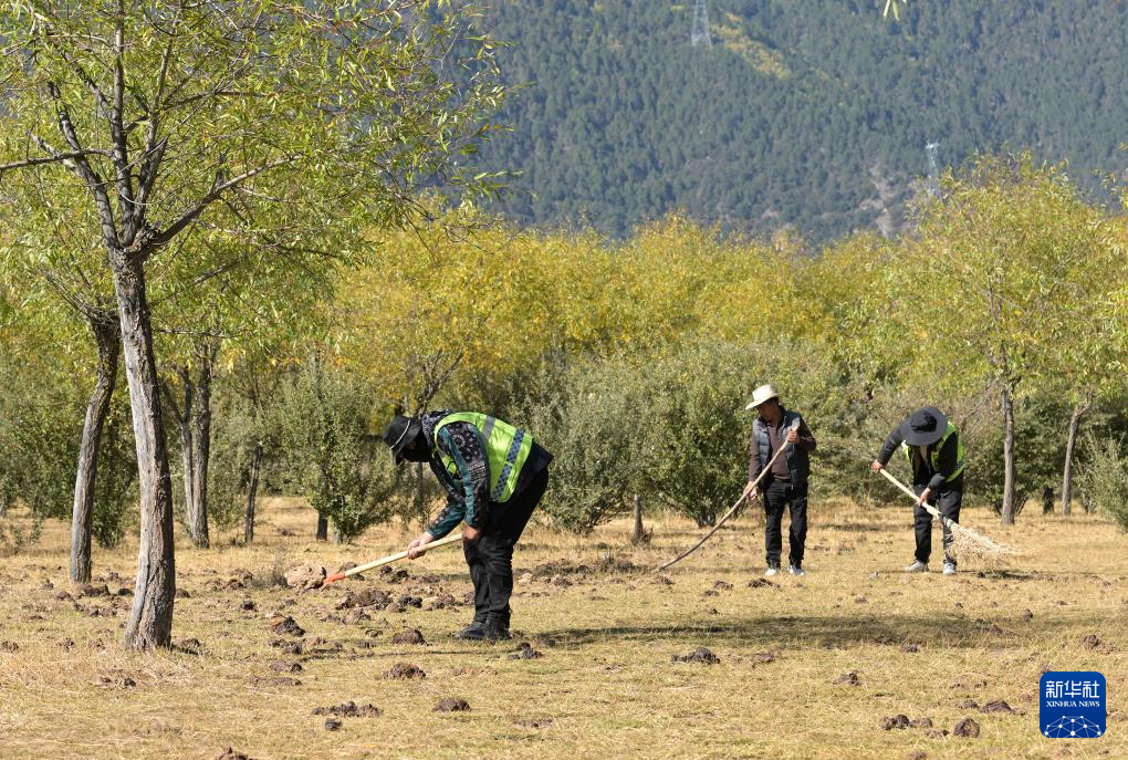 在西藏林芝雅尼國家濕地公園內,濕地管護隊員們進行每日的例行清理維護(10月24日攝)。新華社記者 李賀 攝