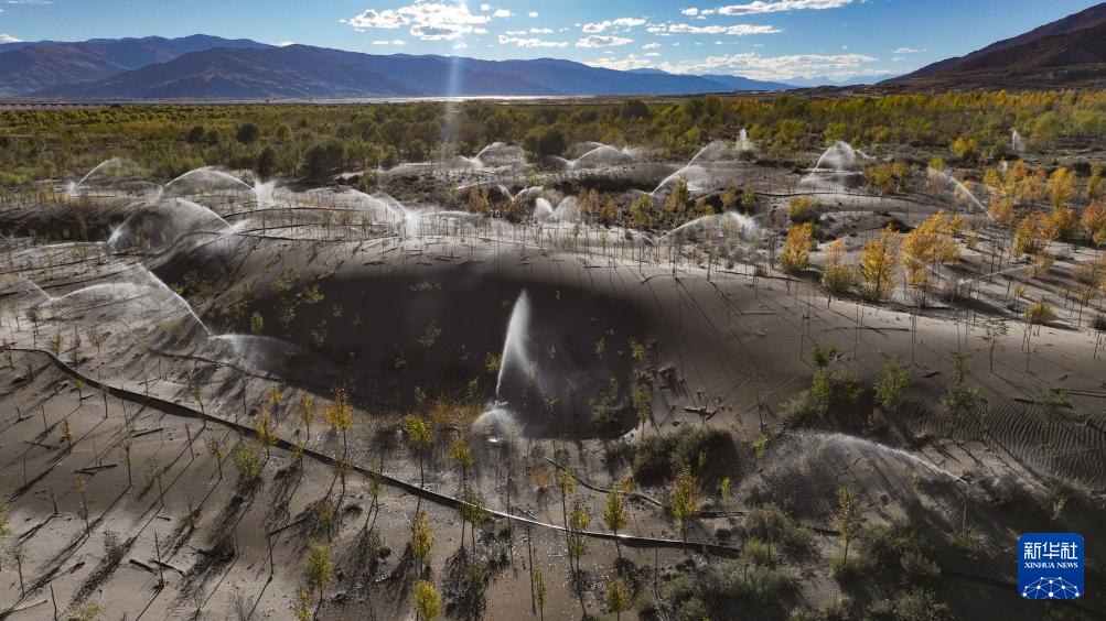 在雅魯藏布江畔,自動灌溉設備給樹木澆水(2024年10月24日攝,無人機照片)。新華社記者 晉美多吉 攝