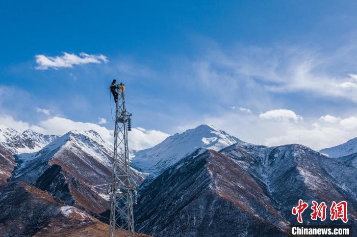 資料圖為2023年11月30日,西藏索縣一條35千伏線路工程施工人員正在開展塔上作業。趙清鵬 攝